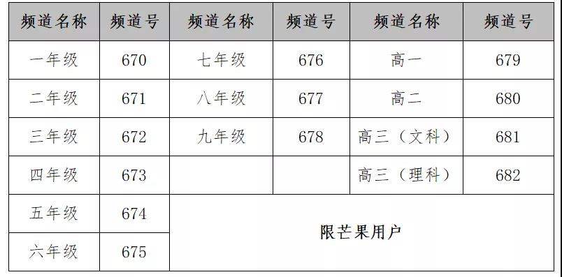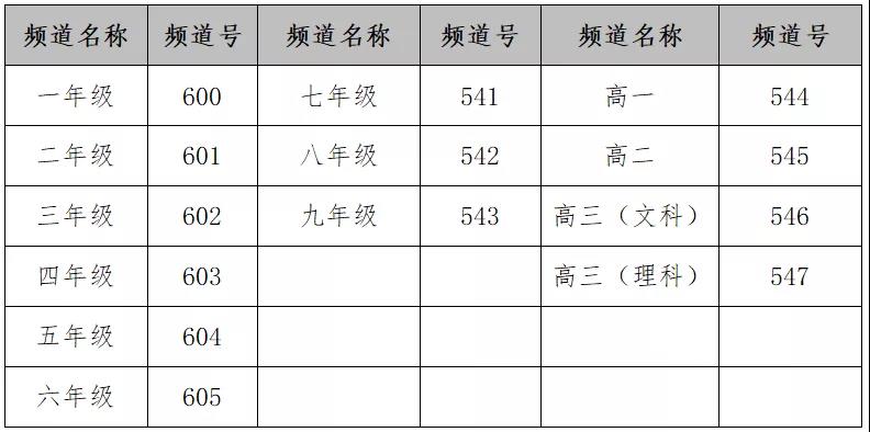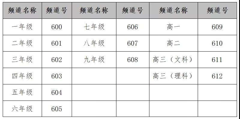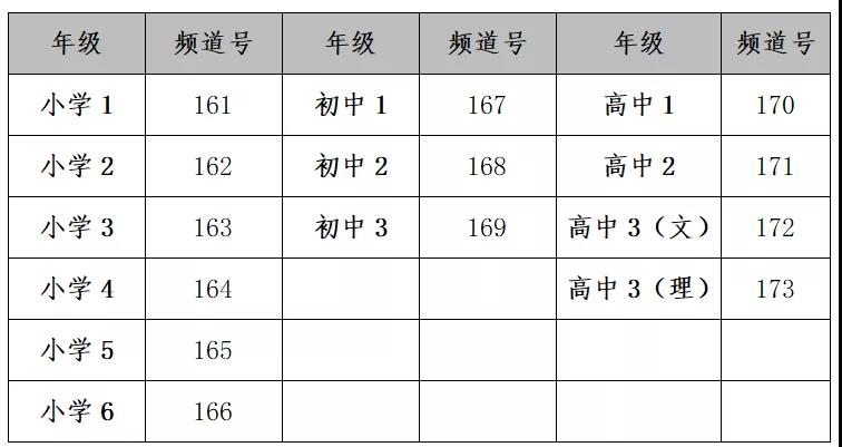 遥控器按频道号进入对应课程,如无法看到频道,可重新搜索频道。小学课程,161-166频道;初中课程,167-169频道;高中课程:170-173频道。浏阳国安用户频道号可能有差异,后续公布。