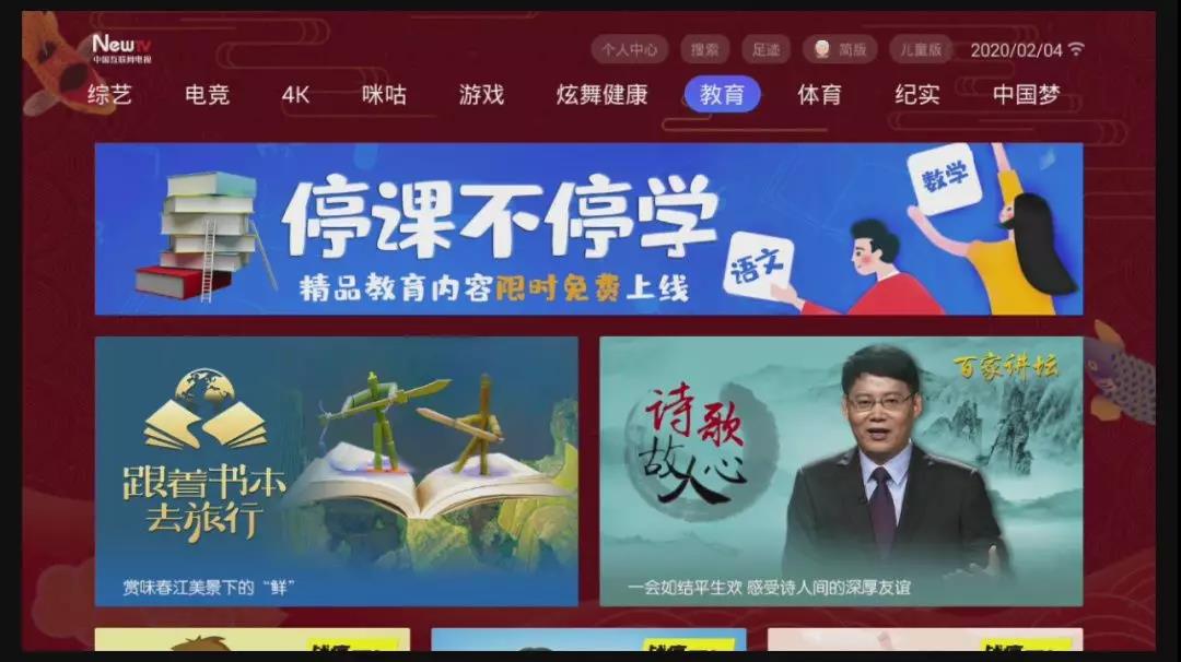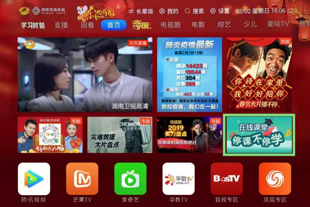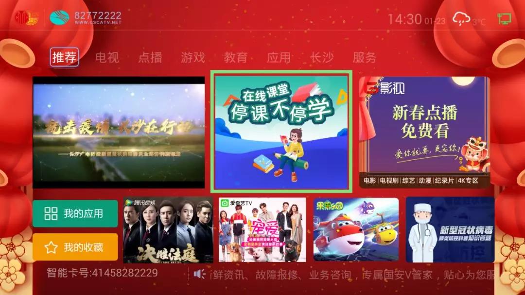 (1)打开湖南IPTV电信新电视,选择“课堂”板块,可以看到“停课不停学”活动的海报图