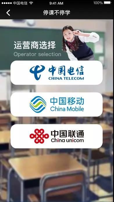 3. 学生点击公众号菜单“停课不停学”下子菜单“学生入口”,跳转学籍信息认证页面。用户输入姓名和全国学籍系统学籍号认证通过进入到运营商选择页面。全国学籍号可以咨询学籍系统学校管理员。