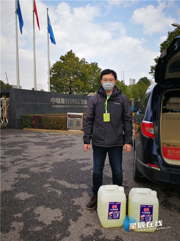 (及时为企业协调解决防疫物资问题,送来84消毒液。)