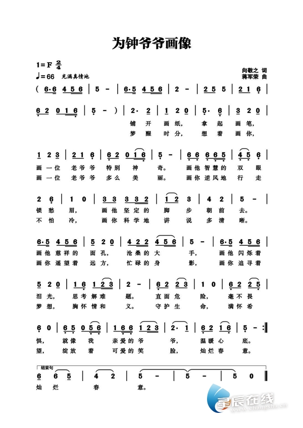 少儿歌曲《为钟爷爷画像》是针对抗击新型冠状病毒肺炎疫情而创作。歌曲节奏稍慢,为F调,2/4拍子,以儿童的眼光和思维切入,为钟南山院士画一幅肖像画,看似粗线条,却有着鲜明、细腻的系列现场景感。歌曲纯粹的切入角度,以孩子满怀真诚的感激之情,为钟爷爷画像,刻画细致、深入,容易产生带入感和认同感。