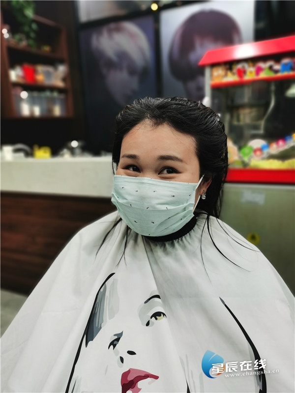(市民在天心区裕南街街道MOOTON美学店理发,为理发店的防疫工作点赞。 谭艳供图)