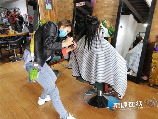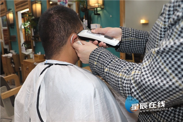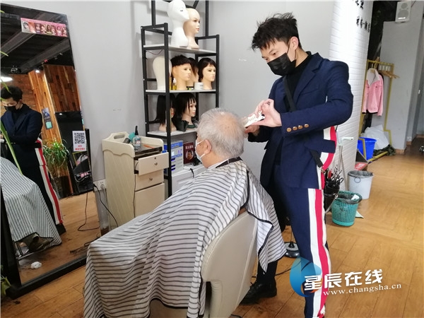 (天心区城南路街道颖川造型店理发师正在为顾客理发。尹欣颖供图)