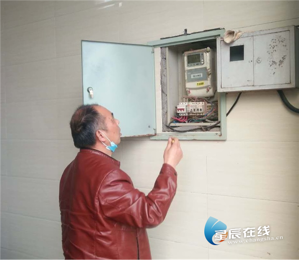 (袁再德在公共垃圾站检查电表箱故障问题。通讯员供图)