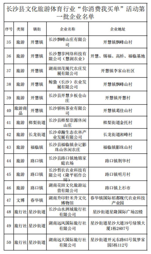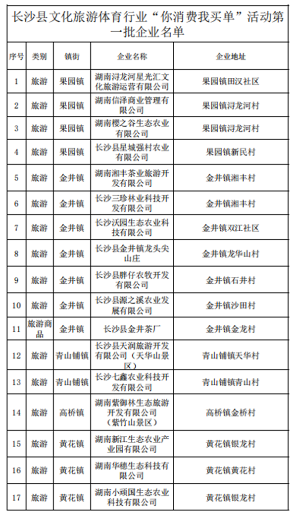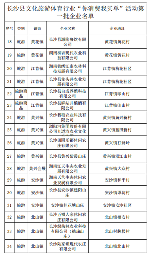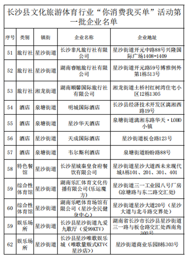附:长沙县文化旅游体育行业“你消费我买单”活动第一批参与企业名单