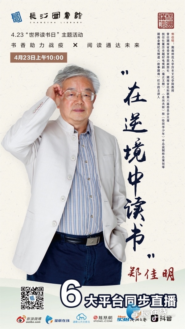 星辰在线4月22日讯(星辰全媒体记者 唐茜茜)在一年一度的“4·23世界读书日”到来之际, 长沙图书馆将启动系列活动,并特邀湖南师范大学历史文化学院教授郑佳明开展专题讲座。星辰全媒体记者了解到,本次讲座以“在逆境中读书”为主题,不仅将教会我们如何从阅读中收获更多力量,更是很好地诠释了世界读书日的精神,星辰在线将会进行全程直播。