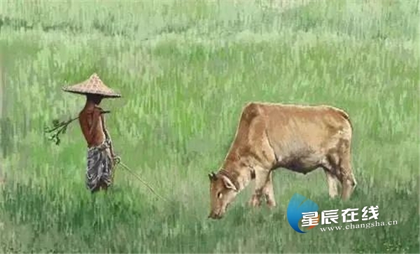 平时样牛一般是牵到路边、田边、江边、圳边。我喜欢到圳边样。圳边因为有水滋润,草比较鲜嫩茂盛。将牛牵到圳边后,让牛站到圳中,这样一方面可以吃到圳两边的草,另一方面有个固定的圳路,牛不得乱走。我站在圳边牵着,有时候甚至可以松开牛绳坐到附近看看连环画。牛沿着圳边走边吃。她吃得很细致,圳边圳底,两边二岸,钉一铆二里吃到切,一根草都舍不得漏过。吃一阵又抬头看看我,我拍拍她的脑袋,她会意地摇一摇尾巴又埋头吃起来。一条百把两百米个圳,她可以恰一早晨.......牛崽还不晓得呷草,在附近路上发癫古样,蹦蹦跳跳,好像骨头底的都是乐。样了大约个把小时,看到家家户户炊烟四起,我就牵着牛往回走,牛边往回走还嚼个不停,津津有味一一大人说,这是“嚼回草”。来到牛栏边,牛娘牛崽都不愿进去,只好勉强推它们进去,松开牛绳,关上栅栏门,它们从栅缝里眼巴巴望着我离开,期待着暗边又牵它们出来......