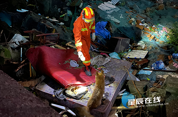 星辰在线6月3日讯(星辰全媒体记者 刘宾 通讯员 谢海鹏)哪里有需要,哪里就有最美”逆行者”消防员的身影。6月2日20时,长沙市开福区消防救援大队伍家岭站接到指挥中心调度称:位于伍家岭南公交车站有一流浪狗被困废墟,伍家岭消防站迅速出动一台抢险救援车前往处置。