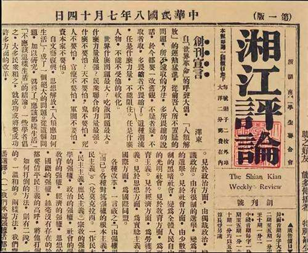 1919年,毛泽东在长沙创办《湘江评论》,他曾在《湘江评论》上写道:“天下者,我们的天下;国家者,我们的国家;社会者,我们的社会。我们不说,谁说?我们不干,谁干?”这些话振聋发聩,激励着许多进步青年在其影响下走上了革命道路。