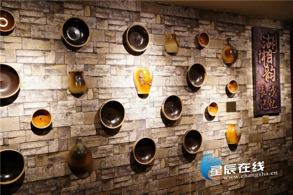 (走出电梯,很难不注意到左手边的满墙陶瓷。这些陶瓷精选自铜官窑,搭配古色古香的墙壁,仿佛时空已经扭转。)