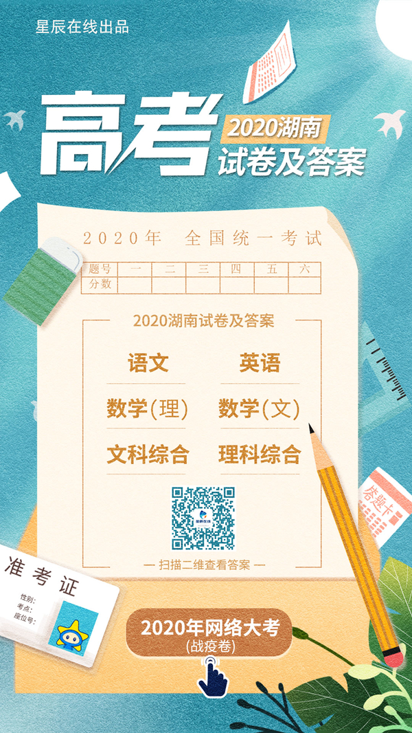 星辰在线7月8日讯(星辰全媒体记者 晨星)7月8日下午,2020年高考最后一门英语考试结束,星辰在线第一时间公布“2020年湖南高考”各科目试题及答案,供考生参考估分,请您及时刷新页面获取最新信息。