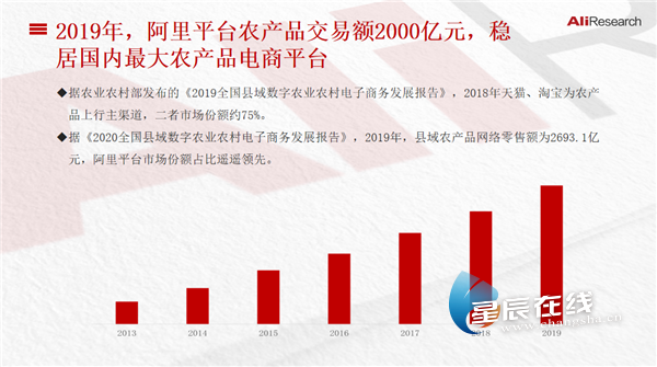 报告是今年阿里巴巴第一次全面公布关于农产品电商的大数据。其中显示,2019年,阿里平台农产品交易额为2000亿元,稳居全国最大农产品上行电商平台。