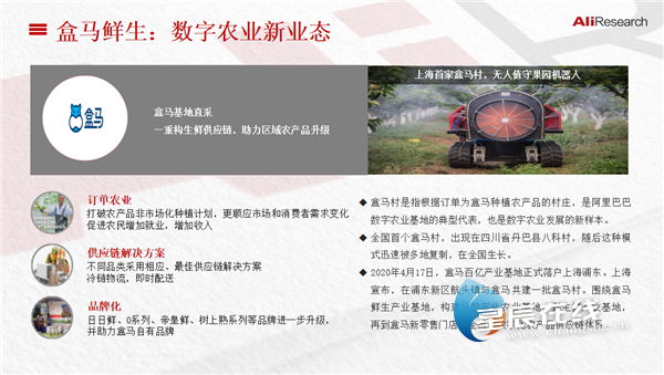 2019年10月10日,阿里巴巴数字农业事业部成立,在数字化生产、物流、营销、金融等方面全面发力,“盒马村”、淘宝直播成了数字农业的新业态。盒马村是指根据订单为盒马种植农产品的村庄,是阿里巴巴数字农业基地的典型代表。今年疫情期间,全国“长出”几十家盒马村,在多地农产品出现滞销时,盒马村无一滞销。