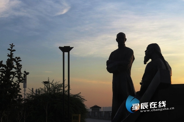 (长沙湘江西岸风光带的林则徐与左宗棠“泊舟夜话”雕塑。星辰拍客 xty408/摄)