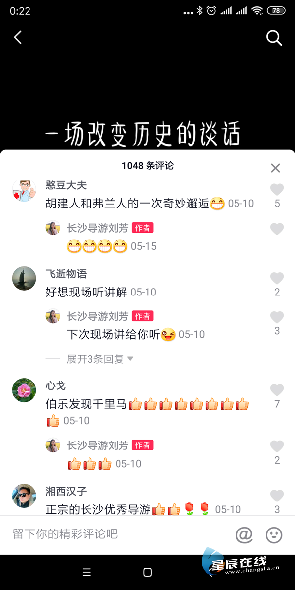 星辰全媒体记者浏览发现,该条短视频作品以深度讲解长沙的人文历史典故,向网友展现湖湘文化的丰富内涵和激发网友市民去网红地打卡为导向,而获得大量网友纷纷点赞跟评,如“就应该多发这样有营养的知识视频”“这些短视频的故事要多多传播” 等,其中比较典型的有网友“心戈”“憨豆大夫”分别点评该场历史谈话为“伯乐发现千里马”“胡建人和弗兰人的一次奇妙邂逅”(注解:胡建和弗兰分别为福建和湖南网络谐音表达) ,吃货网友“东瓜”跟评道“没有左公,我们吃的红枣和哈密瓜都要进口”,网友“浪迹萍踪”感慨道“一部近代史,半部湖南书”。 “@长沙导游刘芳”本尊也点赞教书先生时期的左宗棠为“身在学堂,心在朝堂”。 而更多网友在看了该作品后表示要去长沙湘江西岸风光带的“湘江夜话”雕塑景点拍照打卡,合影留念。截至星辰全媒体发稿时,该作品已获得网友3.6万人次点赞。