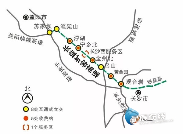 这条与现有长张高速长益段基本平行的高速公路全长50.28公里,双向六车道高速,途经长沙市望城区、宁乡市及益阳市赫山区。东起长沙市望城区观音岩水库西,接长沙绕城高速公路西北段,并顺接银新路,止于益阳市赫山区苏家坝,接既有长沙至益阳高速公路和益阳绕城高速公路。