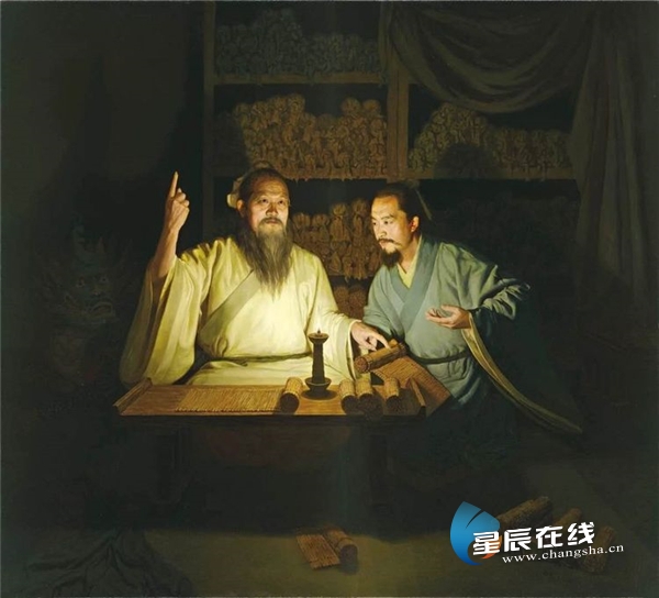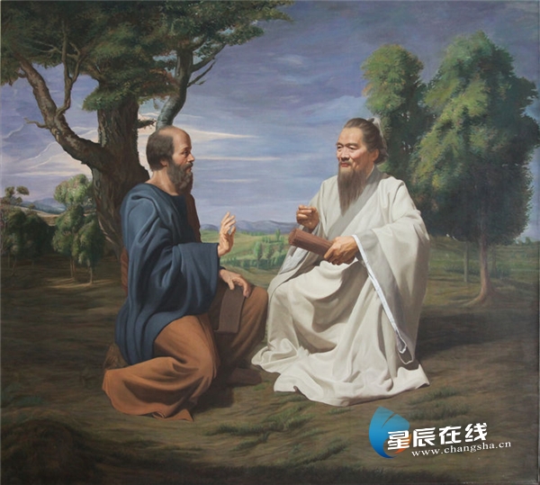 8月13日,夏日的北京,天很蓝,云很白。在国家博物馆“高山景行——孔子文化展”第一展位处,悬挂着一幅大型布面油画《孔子与苏格拉底——中西二圣的对话》。作品描绘了两位东西方“轴心时代”伟大的思想家——中国的孔子与希腊的苏格拉底相遇及热切对话的虚拟场景。