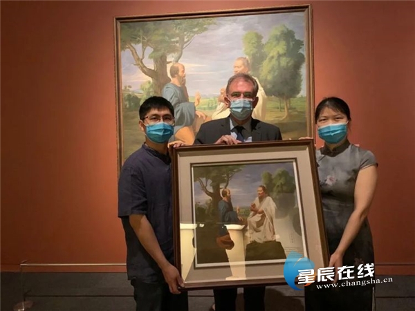 2018年9月,在由北京外国语大学和西班牙驻华大使馆共同主办的“文明互鉴:儒家文化与欧洲文明 纪念庞迪我逝世400周年”万立 唐灼油画展览上,他俩结识了西班牙卡米亚斯大学的达奇教授,达奇教授对他们创作的“文明互鉴:儒学文化与欧洲文明”系列油画表现出十分浓厚的兴趣,并极力推荐给希腊驻华新闻教育参赞海恩福先生;曾于八十年代就在北京留学并在中国工作十多年的“中国通”海恩福先生对东西方文化更是十分了解,当即联系希腊大使乔治•伊利奥普洛斯(Georgios Iliopoulos),力推这一系列作品。应万立夫妇邀请,乔治•伊利奥普洛斯和海恩福答应亲临国家博物馆观展,于是,在8月13日,出现了文章开头的那一幕。