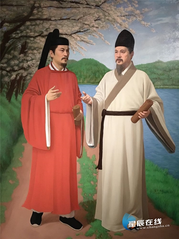 在国博展出的六幅作品中,除了《孔子和苏格拉底——东西二圣的对话》引起了欧洲国家的高度关注,还有另一幅作品,在中日文化交流中写下了浓墨重彩的一笔,这幅画,就是《王仁和菟道稚郎子》。作品展现了朝鲜半岛三国时期,百济国儒学博士王仁与日本皇太子菟道稚郎子在水边的樱花树下漫步,讨论《论语》的场景。