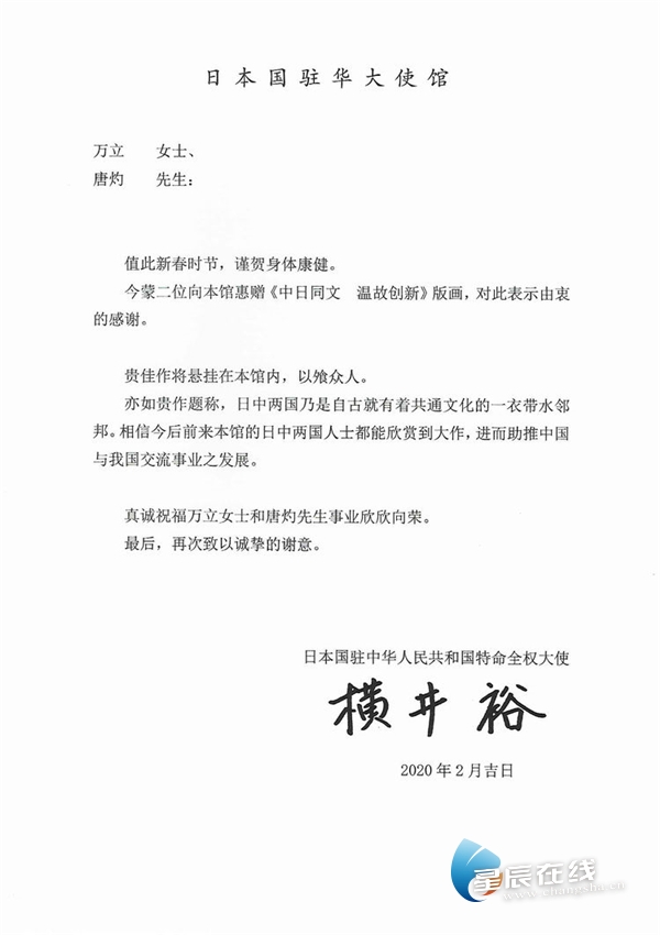 当天下午,福田康夫先生回国之前,将这幅画赠送给前来机场送行的日本驻华使馆官员。他叮嘱,这幅画要挂在北京的日本驻华大使馆里,以展示中日文化交流的历史,成为使馆人员参考的资料。随后,日本驻华大使横井裕于今年2月特意向两位画家发出了感谢信。这幅版画现已长期展示在日本驻华大使馆内,以飨众人。