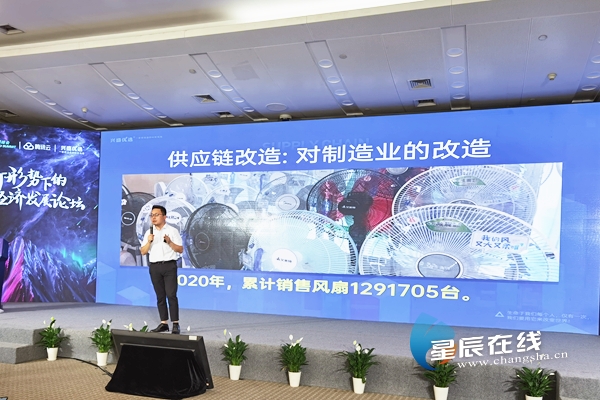 (湖南兴盛优选电子商务有限公司副总裁、董事长刘辉宇以《线上线下数字融合发展的新机遇》为题发表演讲。除标注外,图片均由 星辰全媒体记者 梁文婷 摄)