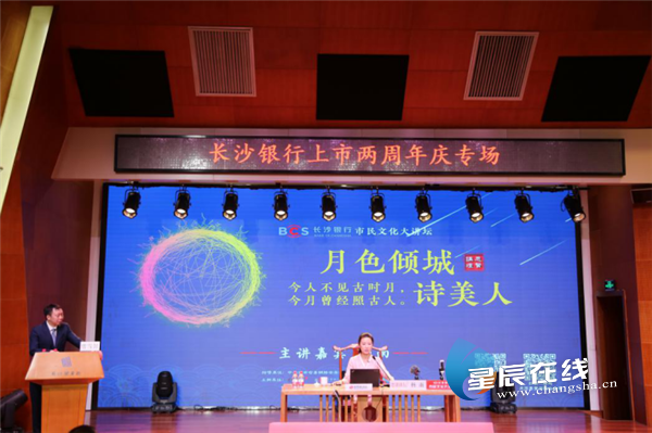 (9月26日,长沙银行上市两周年庆专场讲座特邀中南大学文学与新闻传播学院教授、中央电视台《百家讲坛》主讲人杨雨,在中秋佳节到来之际隆重开讲,与大家分享那些和月亮有关的诗词,阐幽发微。)