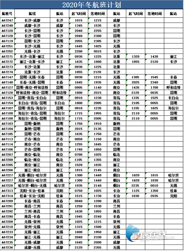 星辰在线10月14日讯(星辰全媒体记者 谭芳 通讯员 刘佳) 据悉,我国民航系统在每年的3月和10月下旬左右,都要进行两次航班计划调整。10月25日起,全国民航业将开始执行2020冬春航季计划。此次航班换季,湖南航空着眼冬春航季市场需求及特点,进一步优化运力布局和航线网络结构,以长沙、昆明、无锡、南京等基地城市为主要出发城市,计划执行国内航线21条,新增航线5条,满足广大旅客冬春季节不断增长的航空出行需求