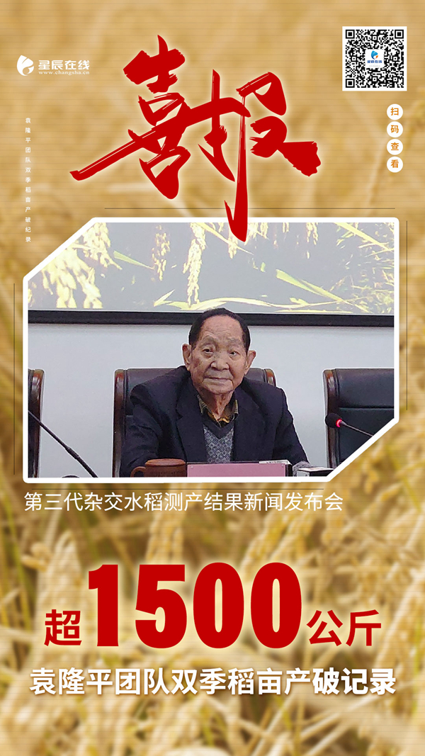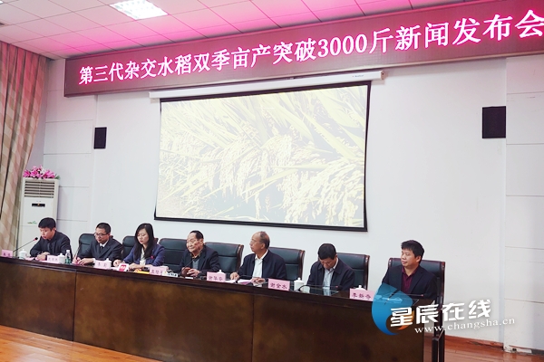 星辰在线11月3日讯(星辰全媒体记者 胡伟男 贺奕翔)11月3日上午,第三代杂交水稻双季亩产突破3000斤新闻发布会在湖南杂交水稻研究中心举行。星辰全媒体记者从会上获悉,11月2日,由湖南省农学会组织的第三代杂交水稻测产工作在湖南省衡南县清竹存进行,来自全国各地的农业专家组成的专家组在现场进行了双季晚稻测产。按照国家农业农村部统一的程序和公式进行测产与计算,测得晚稻平均亩产为911.7公斤。今年7月,衡南该基地早稻高产攻关田进行了测产验收,测得早稻平均亩产为619.06公斤。早稻加晚稻突破亩产3000斤的目标。