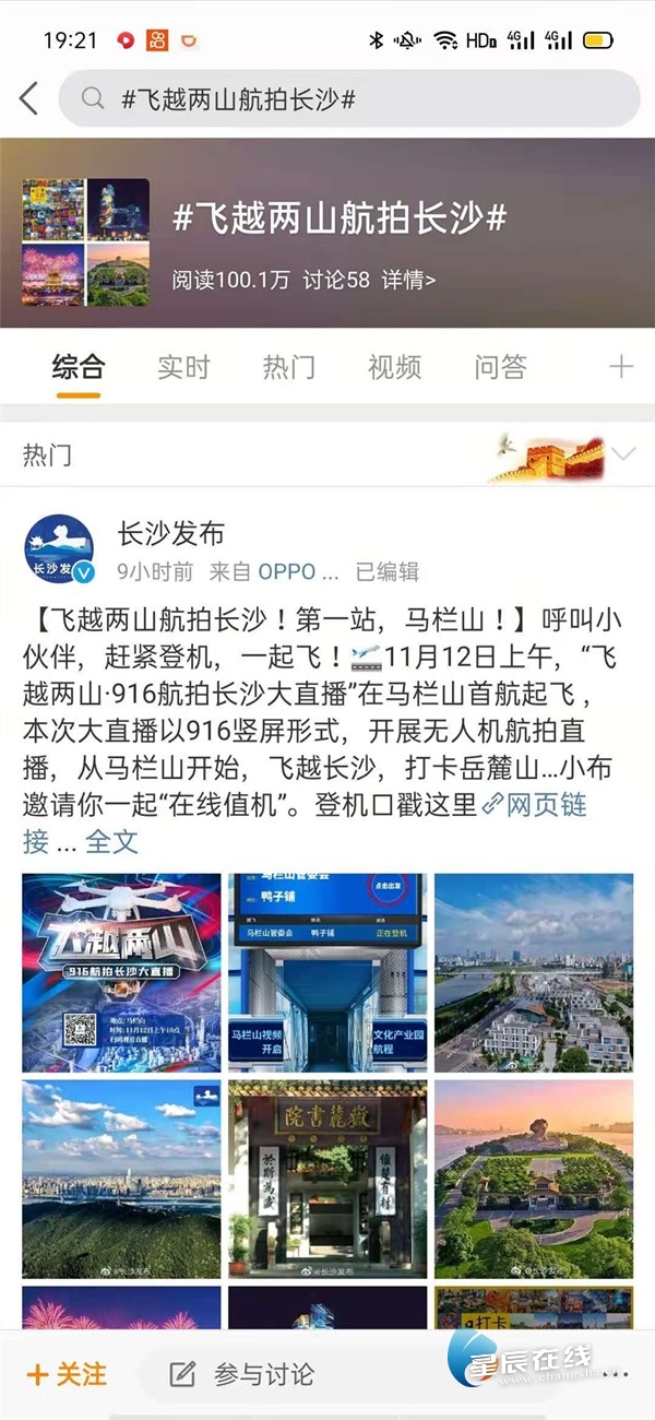 (飞越两山·916航拍长沙大直播仅微博话题互动就有100万。手机截图)