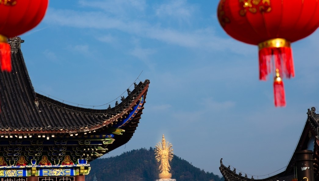 密印寺后面的山腰处,矗立着一尊高大的千手观音,高达99.19米的千手观音,雄伟壮观,在没进寺庙之前,就远远地看见了,如同踏莲驾云而来。据说,这是目前全国最高的千手观音神像。离千手观音越来越近,越是感觉到神像的高大巍峨,人在其下,倍觉渺小。主佛像周围还有33尊观音化身像。站在此处,密印景区尽收眼底,山下的密印寺,不时有袅袅梵音飘来……