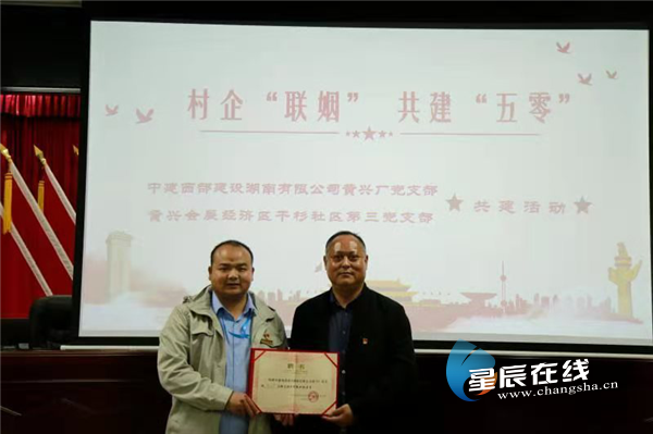 星辰在线11月24日讯(星辰全媒体记者 谭啸宇 通讯员 寻芳)日前,在长沙县黄兴会展经济区“村企联姻、共建五零”的活动上,黄兴会展经济区干杉社区党总支书记周新辉向中建西部建设湖南有限公司黄兴厂副厂长、党支部副书记何明颁发“乡村振兴助力员”聘书,这标志着中建西部建设湖南有限公司黄兴厂党支部与黄兴会展经济区干杉社区第三党支部正式结对共建。