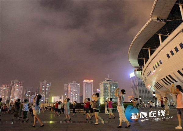 (市民在长沙贺龙体育中心东广场跳广场舞。)