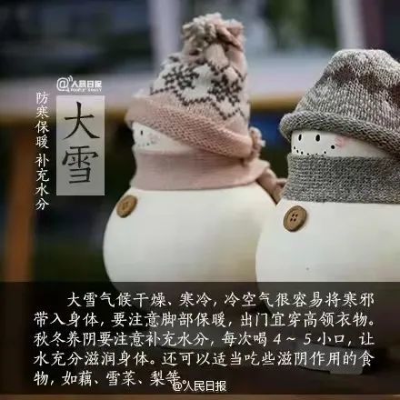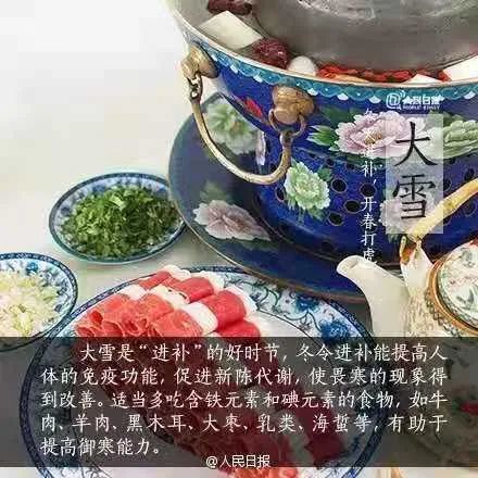 大雪是“进补”的好时节,素有“冬天进补,开春打虎”的说法。冬令进补能提高人体的免疫功能,促进新陈代谢,使畏寒的现象得到改善。冬令进补还能调节体内的物质代谢,使营养物质转化的能量最大限度地贮存于体内,有助于体内阳气的升发,俗话说“三九补一冬,来年无病痛”。此时宜温补助阳、补肾壮骨、养阴益精。冬季食补应供给富含蛋白质、维生素和易于消化的食物。