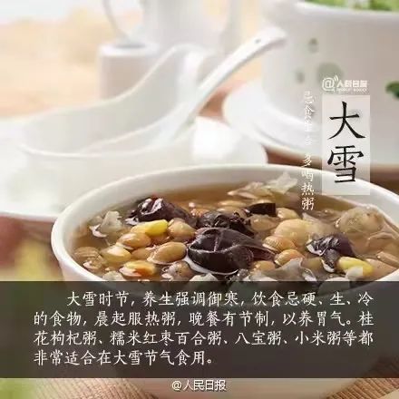 适宜:牛肉、花生、核桃、冬笋、橙子、苹果、可以多食带苦味的食物,如猪肝、鸡肝、鸭肝、莴笋、芹菜、桔梗、枸杞、白果等。“大雪补得当,一年不受寒”,应适当吃些温热食物,以祛寒补气血:牛肉、花生、核桃、大枣、桂圆肉、韭菜等。同时也得搭配些白菜、萝卜、茼蒿、冬笋、橙子、苹果、梨等,清热,消食通便。