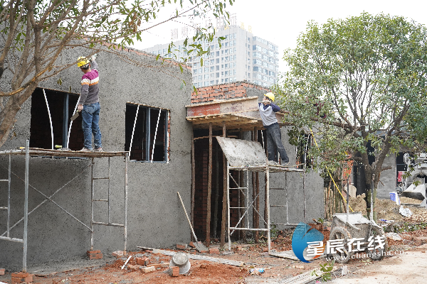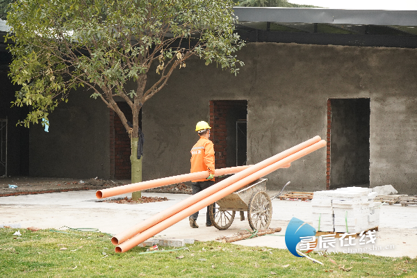 (施工工人正在锦泰广场提质改造项目现场忙碌。)