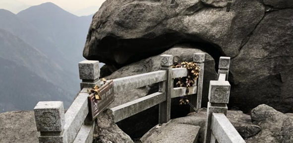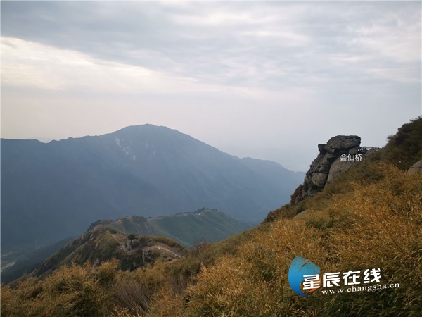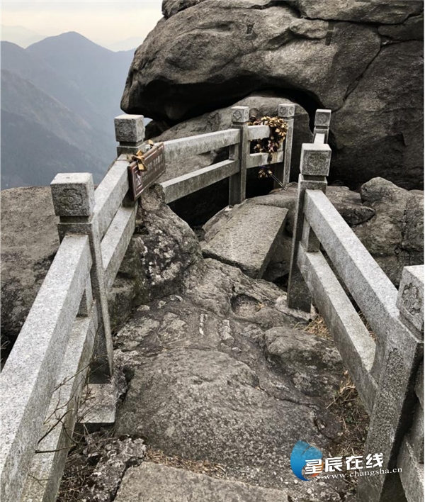 从上封寺出来,从山间小路,复行二十分钟,祝融峰顶已然近在隔涧。行途中,山中护栏上刻有许多著名诗人游览南岳留下的诗词,不免感叹衡山文化底蕴之深厚。台阶上行,山壁上有字刻:会仙桥,转弯见到两处高石,中间一块青石板,两侧有护栏。石板下方是高耸的悬崖,桥上风声呼唳,铁锁摆荡。一如张栻在当年到此地时,也难免心惊胆战,后来他在《游南岳唱酬序》中写道:“乙卯,武陵胡实广仲、范彦德伯崇来会。同游仙人桥。路并石,侧足以入。前岩挺出,下临万仞之壑,凛凛不敢久驻。”这时从崖边巨石看向远天,夕阳拨开云层洒下,折射溢彩,一时竟有半分佛光普照之势。