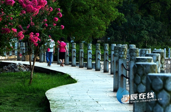 再说紫薇。大概是2010年,长沙街道两旁的绿化带、街心公园等公共绿化场所,忽然多了许许多多的紫薇。紫薇属落叶灌木或小乔木,树姿优美,树干光滑洁净,花色艳丽。紫薇开花时正当夏秋少花季节,花期长,有“百日红”之称,又有“盛夏绿遮眼,此花红满堂”的赞语。据说,时任市政府主要领导到市城管局调研时,提出可以在公共绿化场所多栽种紫薇,市城管局立即落实,并报告市长先不要大肆宣传,待采购足够的紫薇树种后再向市场公开,避免了市场闻风涨价。咸嘉湖公园建设时,在湖边、坡地上也栽种了不少紫薇,这个季节里正开得烂漫灿然。