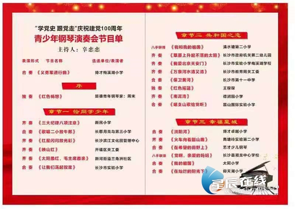 齐奏《三大纪律八项注意》《太阳最红,毛主席最亲》《火车向着韶山跑》,合奏《浏阳河》《在希望的田野上》《唱支山歌给党听》《我的祖国》,八手联弹《我和我的祖国》《党啊,亲爱的妈妈》……6月11日上午10点,让我们云端相聚,在一段段红色旋律中,追寻红色记忆,领略星城青少年风采。(点击收看:学党史 跟党走——庆祝建党100周年青少年钢琴演奏会直播)