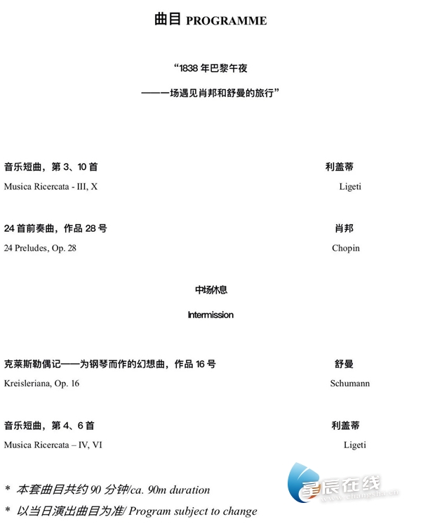 肖邦与舒曼都出生于1810年。音乐会的曲目由肖邦和舒曼的两部完整的音乐巨著组成。上半场肖邦的《24首钢琴前奏曲》,作品28号,始作于1838年。这套24首前奏曲使用了钢琴全部的24个大小调,似乎用24个大小调,体味了人生的百态。这部作品不但是肖邦的代表作之一,也是浪漫主义的桂冠之作之一。下半场舒曼的《克莱斯勒偶记》,作品16号,完成于1838年,提献给肖邦,同样是舒曼的经典代表作之一。全曲分8个乐章,每个乐章都有独自的个性、风格和特点,符合了舒曼的“激情与温柔”共存的夸张创作理念。