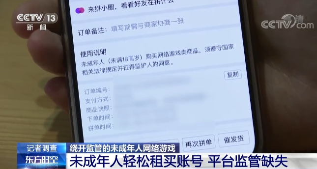 记者用一名15岁孩子实名认证的账号,分别在多家电商平台尝试购买游戏账号。在淘宝网,部分商家页面出现了未成年人拦截界面,但记者仍在更多未设置未成年人拦截界面的商铺买到了“租号服务”。在拼多多则不需要任何认证,就可以直接拼单购买。在京东商城,商家仅自动回复信息提示“下单默认已经成年”,下单后记者很快就收到了游戏账号及密码。针对上述违规违法租售网络游戏账号的用户和商铺,向相关平台进行了举报、投诉。