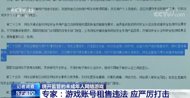 中国政法大学传播法研究中心副主任 朱巍:这些商业行为现象本身就是违法的,因为即便是成年人把账号卖给成年人,就是一个违法行为。因为这里涉及个人信息的问题,涉及网络行为的实名认证的问题。你用A的人注册,用B的方式去登录,很多的电信诈骗就是通过互联网上虚假账号登录的方式去完成的。所有的游戏平台包括互联网平台,其中涉及账号的问题,在网民协议中都有明确的规定,绝对不允许用任何方式转让租借的。所以这一个行为,既违反了民事法律规定也违反了行政法律规定,甚至有可能如果大批量去出售出卖账号的话,还可能涉及国家《刑法》涉及的罪名,就是侵害公民个人信息犯罪,所以是一个非常严重的违法行为。