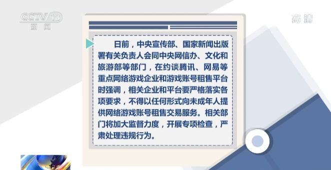 日前,中央宣传部、国家新闻出版署有关负责人会同中央网信办、文化和旅游部等部门,在约谈腾讯、网易等重点网络游戏企业和游戏账号租售平台时强调,相关企业和平台要严格落实各项要求,不得以任何形式向未成年人提供网络游戏账号租售交易服务。相关部门将加大监督力度,开展专项检查,严肃处理违规行为。