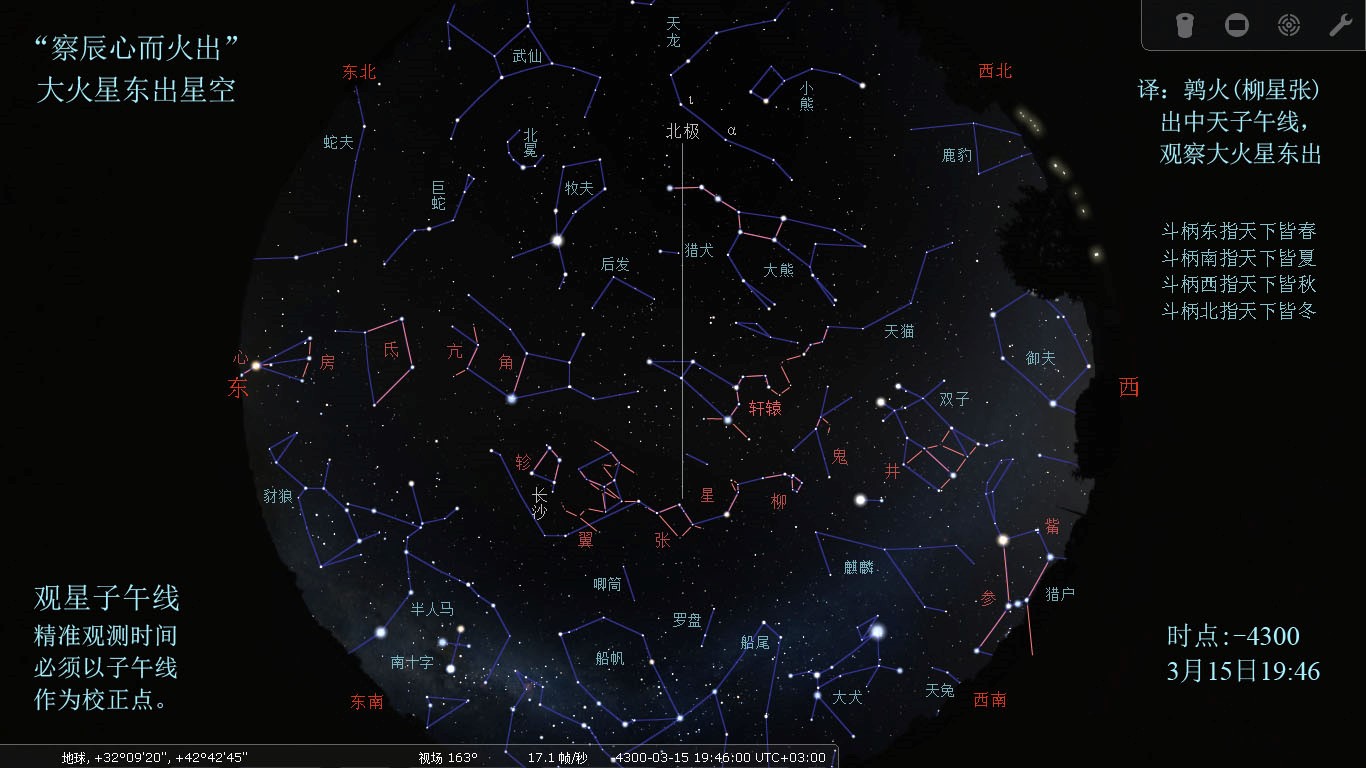 大火星,即心宿二(天蝎座α)。查北京天文馆监制的星盘、Stellarium星空软件,大火星东出时间是6月上旬19时、7月上旬17时左右;西落时间是6月底7月初2时,7月底8月初子夜(0时)。17~19时是酉时,古代观星的初昏时间。(图15)星空软件(Stellarium)的复验附后。