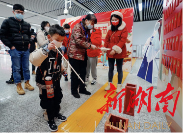 当天下午,在长沙地铁芙蓉广场站厅内,一场精心打造的虎年游园会吸引市民驻足,市民们可以参与抽新年签、投壶等传统游戏,还能抽取中奖率高达100%的幸运红包。同时游园会内还上演了汉服走秀,身着汉服的模特依次登场,展现出中华民族传统服饰的秀美,特别是一位“汉服奶奶”,优雅的气质、饱满的精气神吸引了众多市民的关注和点赞。
