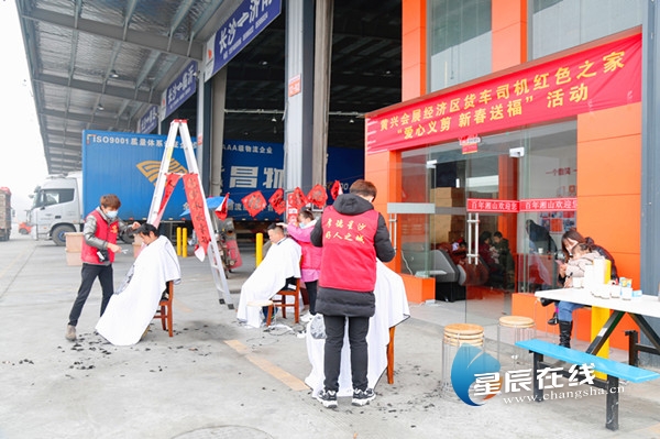 1月19日,走进晟象智慧物流园区,黄兴会展经济区“货车司机红色之家”正在开展“爱心义剪 新春送福”活动,这是“货车司机红色之家”推出的众多特色活动之一。在“小红象”驿站门口,三位司机师傅排排坐,剪着头发,享受着难得的清闲。