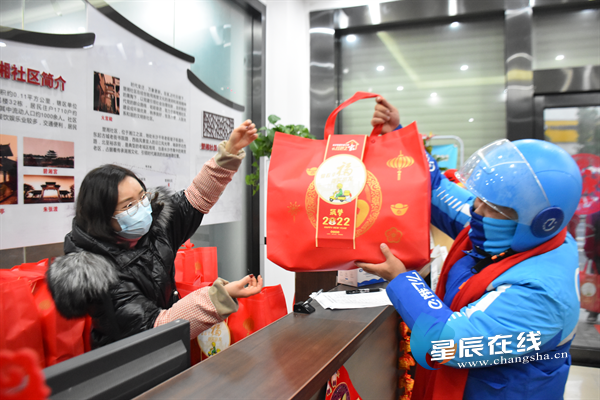 (留长过年的快递外卖小哥领取“家庭”大礼包。)