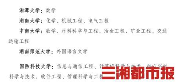 2月14日,第二轮“双一流”建设高校及建设学科名单正式公布。中南大学、湖南大学、湖南师范大学、湘潭大学、国防科技大学入围。