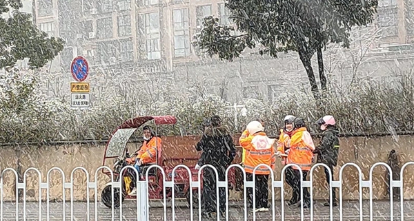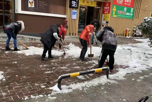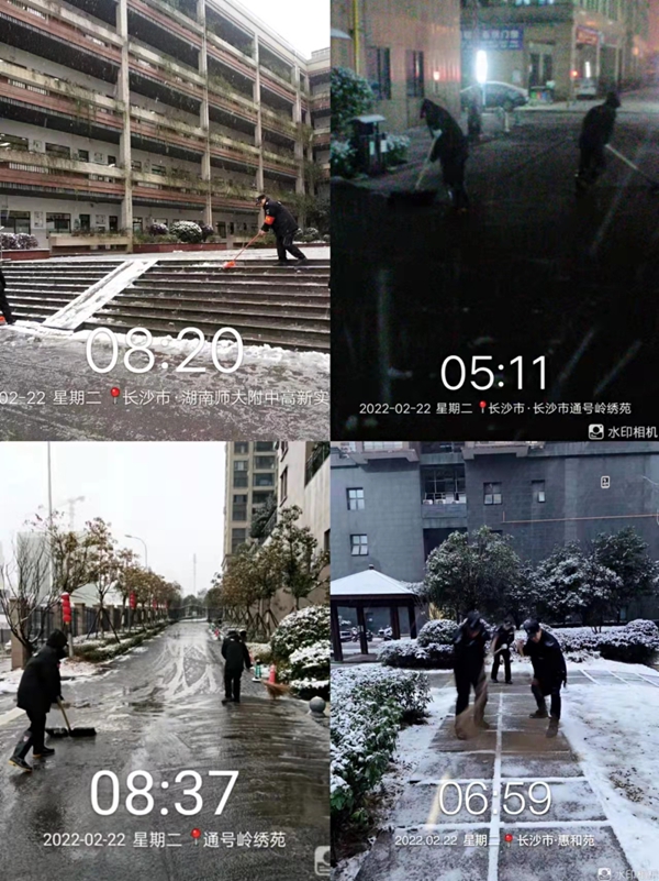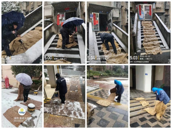 (2月22日清晨,长沙高新区住建局号召全区物业服务企业工作人员和志愿者开展了“情暖冬日·铲冰除雪”志愿服务活动。)