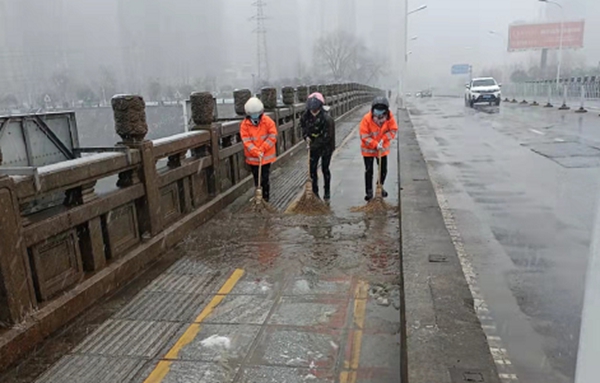 (芙蓉区东岸街道安委办联合城管办、东岸环卫所等,对东屯渡桥路段进行路面撒盐防冰冻处置。)