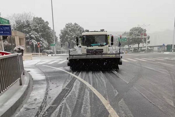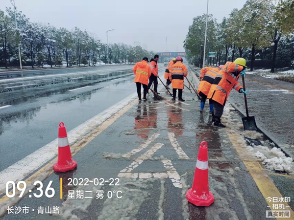 (盈峰中联环境长高项目公司作业人员集中清理岳麓大道、青山路等处积雪。)